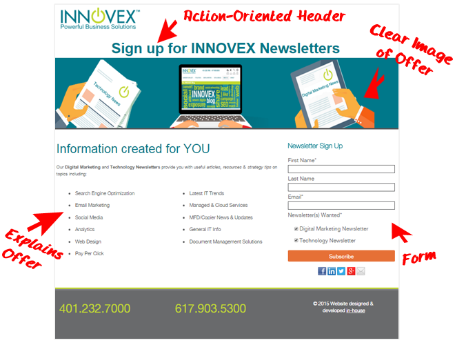 Don’t pollute your page with too many bullets describing the offer either. Write in a way that is very concise and enticing so that the offer becomes even more desirable. For example, if you’re offering a downloadable eBook, you don’t need to state each section of the eBook; rather, share key points that will make your prospect hungry for me. Ask yourself – what value will your prospect gain from this asset? Also, be sure to leave out site navigation and links to other pages. When a prospect is on a landing page, we want to make sure their focus is only on the offer.