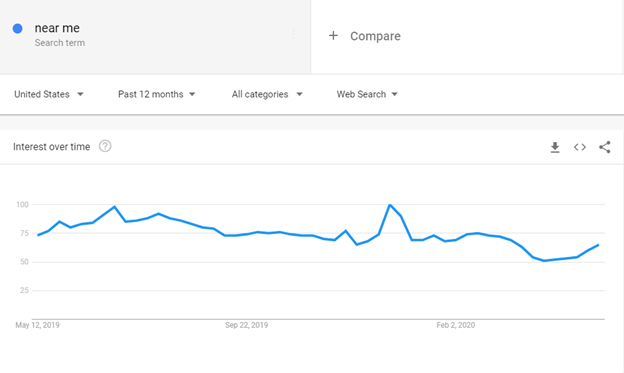 Here is, for example, the consistency with which people have used the term “near me” in Google searches, according to Google Trends: