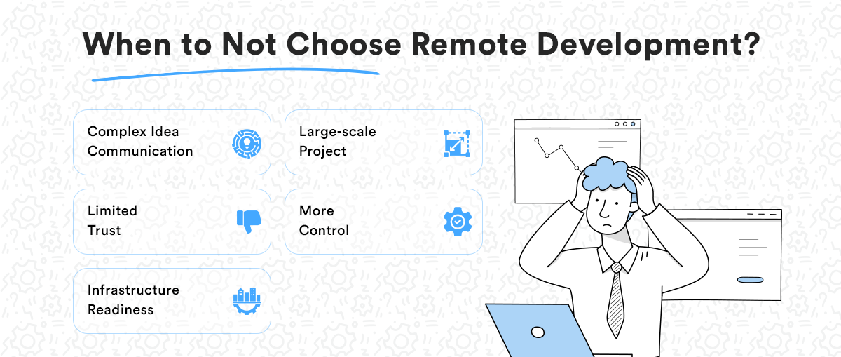 These were some of the most common cases in which businesses should opt for remote development over in-house development. Moving further, we will take a look at cases when hiring a remote development team isn’t an ideal option for businesses.