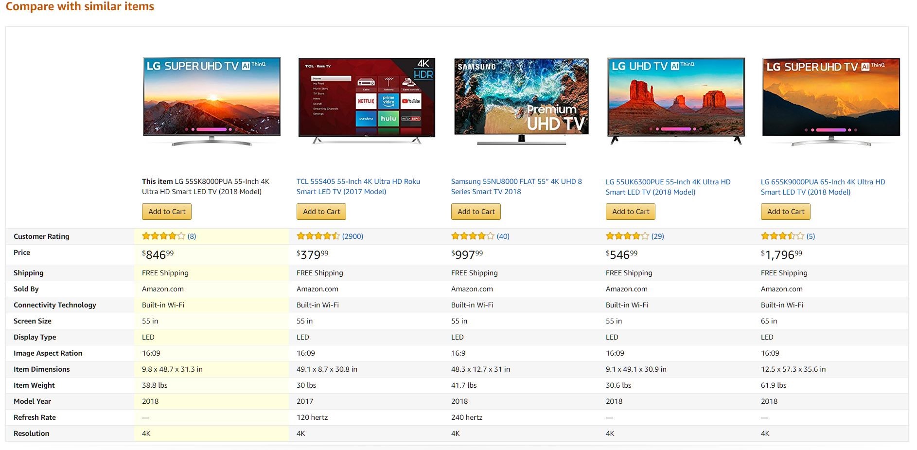 You don’t necessarily need the accompanying text with those review scores, either. You can see at a glance which of these TV sets is more coveted by consumers, along with pricing info and specifications to boot.